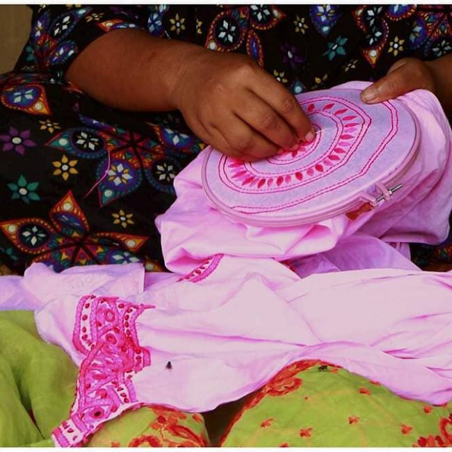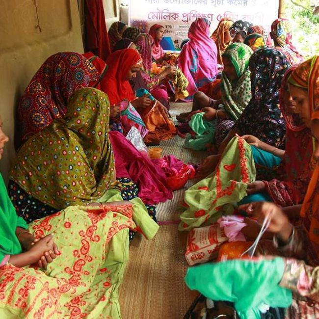 Ashrai has been providing various types of support to the poor and Adibashi women of the Barind area by forming business clusters to engage in hand embroidery on garments, enabling them to increase product sales and achieve a sustainable, regular family income. Ashrai provided training and technical support to improve the quality of designs, fashion, product diversification, and market expansion through several projects funded by donors and PKSF. One hundred women entrepreneurs from one hundred business clusters have been trained in 25 unions of Mohonpur Upazila in Rajshahi district, and Chapai Nawabganj Sadar and Nachol Upazilas in Chapai Nawabganj district. Each business cluster consists of 30 members. They have been trained in embroidery on saris, three-piece sets, short Panjabis, Panjabis, Nakshikantha, cushion covers, and bed sheets. Thus, through appropriate training, about 3,000 women gained opportunities for self-employment. Ashrai has initiated the establishment of the Ashrai Crafts Centre to ensure the production and marketing of high-quality, fashionable products by skilled women for national and international markets.