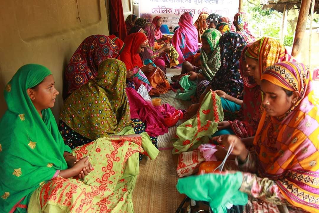 Ashrai has been providing various types of support to the poor and Adibashi women of the Barind area by forming business clusters to engage in hand embroidery on garments, enabling them to increase product sales and achieve a sustainable, regular family income. Ashrai provided training and technical support to improve the quality of designs, fashion, product diversification, and market expansion through several projects funded by donors and PKSF. One hundred women entrepreneurs from one hundred business clusters have been trained in 25 unions of Mohonpur Upazila in Rajshahi district, and Chapai Nawabganj Sadar and Nachol Upazilas in Chapai Nawabganj district. Each business cluster consists of 30 members. They have been trained in embroidery on saris, three-piece sets, short Panjabis, Panjabis, Nakshikantha, cushion covers, and bed sheets. Thus, through appropriate training, about 3,000 women gained opportunities for self-employment. Ashrai has initiated the establishment of the Ashrai Crafts Centre to ensure the production and marketing of high-quality, fashionable products by skilled women for national and international markets.